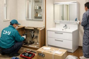 具体的には、既存洗面台の撤去、新しい洗面台の設置、給水管と排水管の接続、設置後の簡単な動作確認までが基本範囲です。